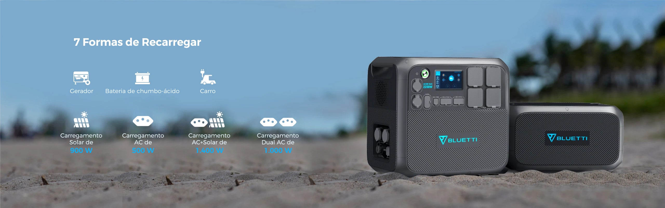 R:1.400 W máx. via tomada de parede de 500 W e painéis solares de 900 W simultaneamente.