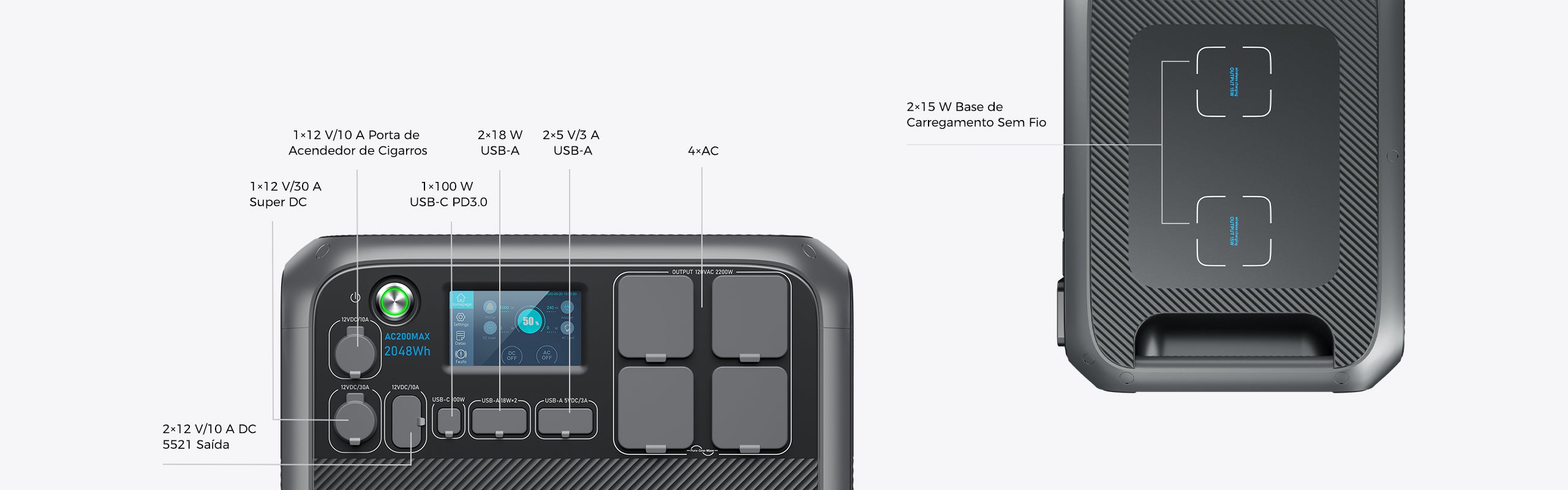 1. Potência de saída e capacidade: potência AC de 2.000 W e capacidade de 2.048 Wh para o AC200MAX, enquanto 2.000 W e 2.000 Wh para o AC200P.