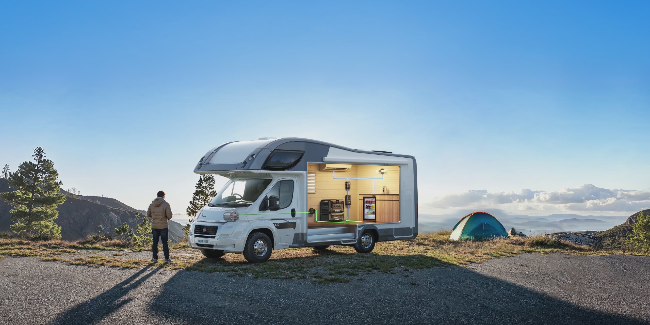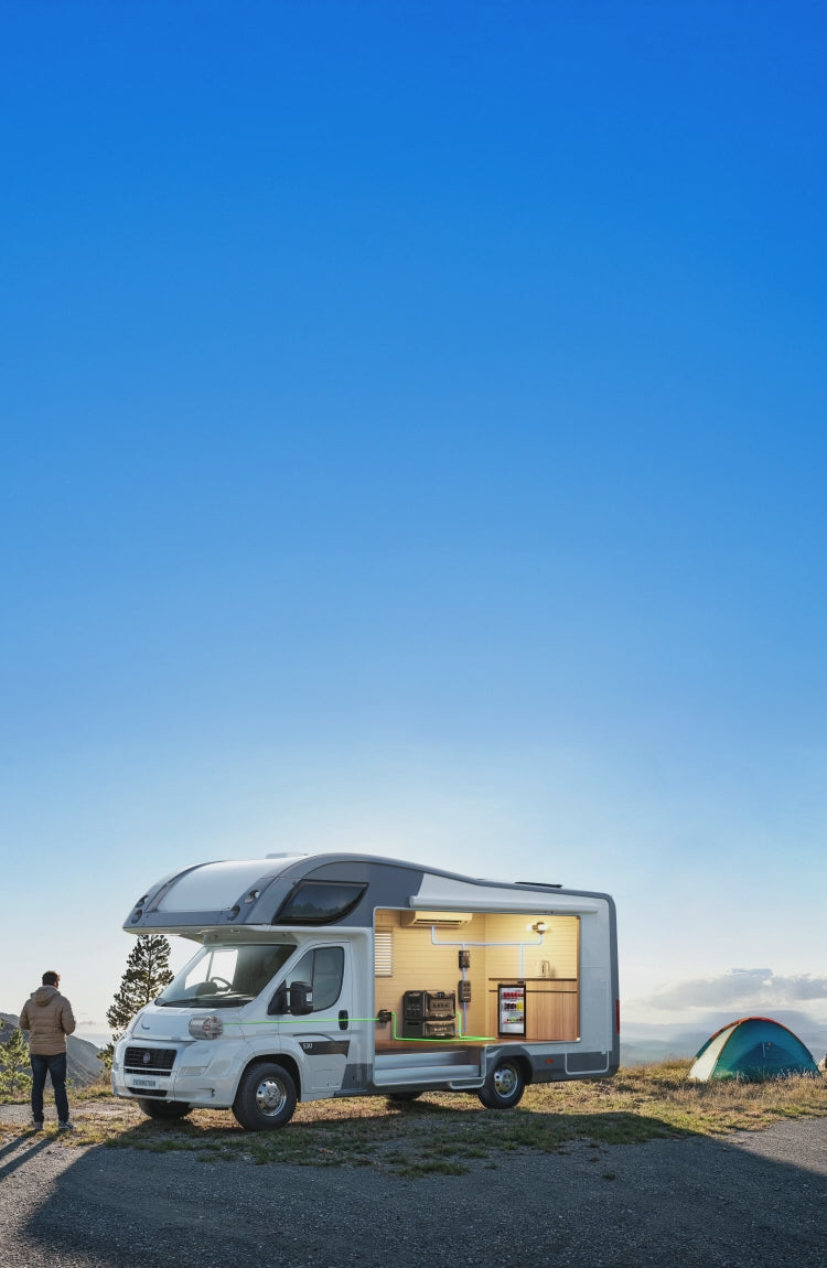 O Apex 300 oferece uma solução fácil de instalar para fornecer energia CA e CC completa em seu veículo recreativo. Com instalação integrada, ele atende a todas as suas necessidades de energia CC e permite conexões CA simples e práticas para dispositivos como cafeteiras e fornos. Desfrute de energia estável e confiável em suas viagens de RV.
