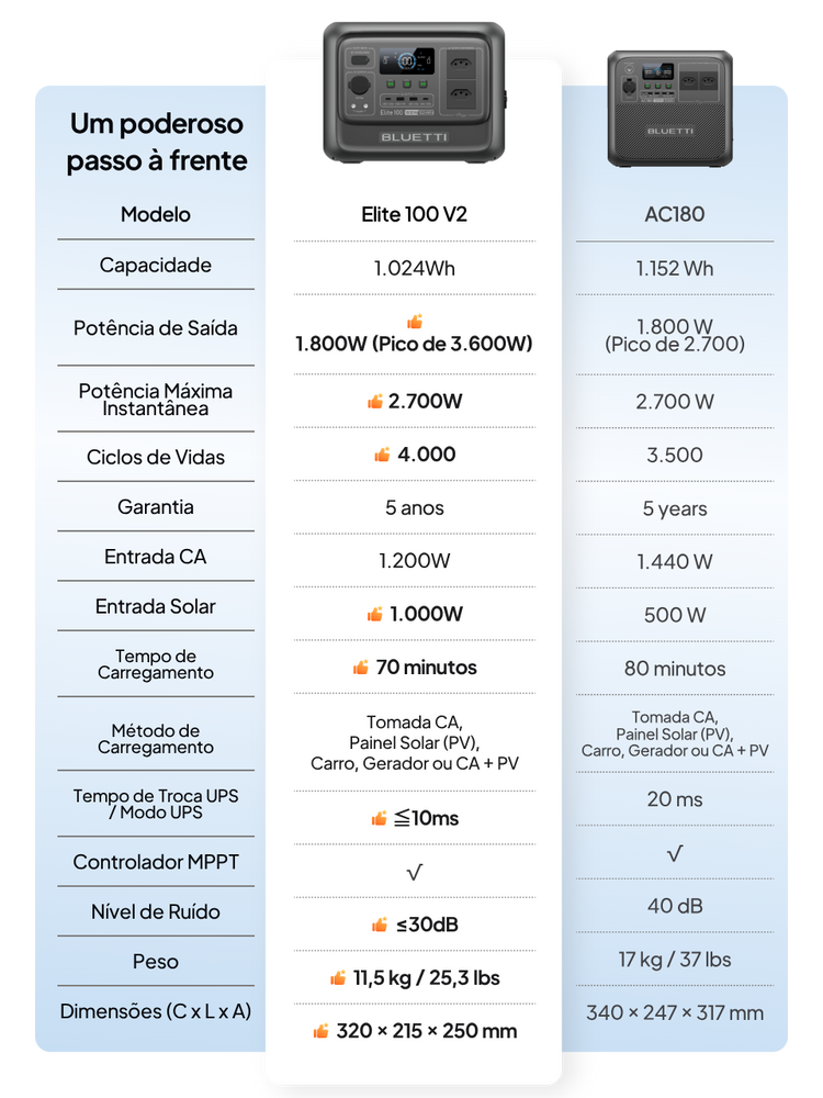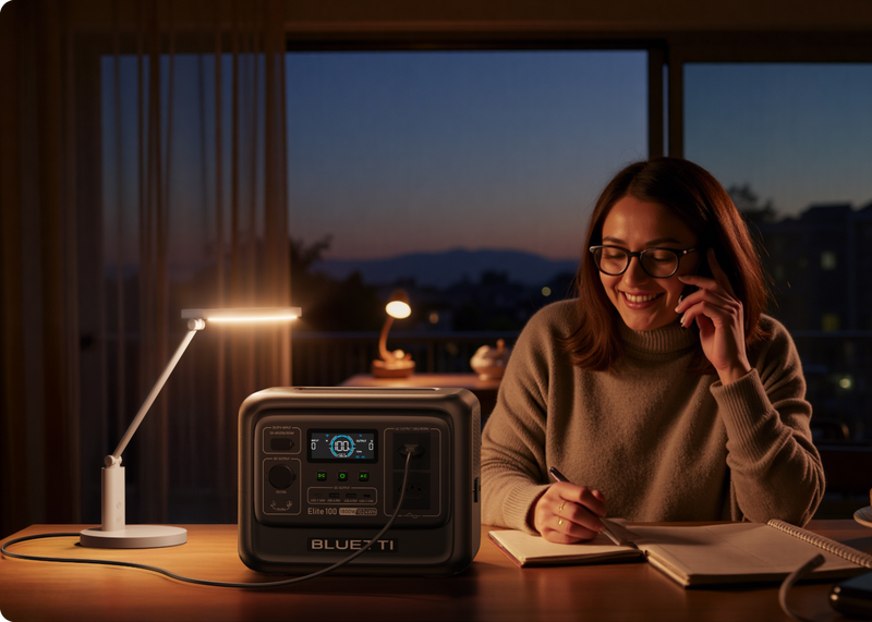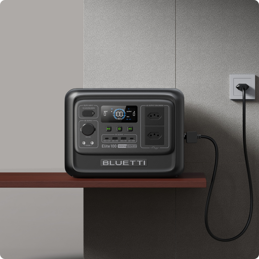 O Elite 100 V2 é a mais recente estação de energia portátil leve da BLUETTI, com capacidade de 1.024Wh e saída de 1.800W. Seja para enfrentar quedas de energia, acampar, alimentar seu RV ou manter dispositivos sensíveis como CPAP funcionando, o Elite 100 V2 é a solução ideal.