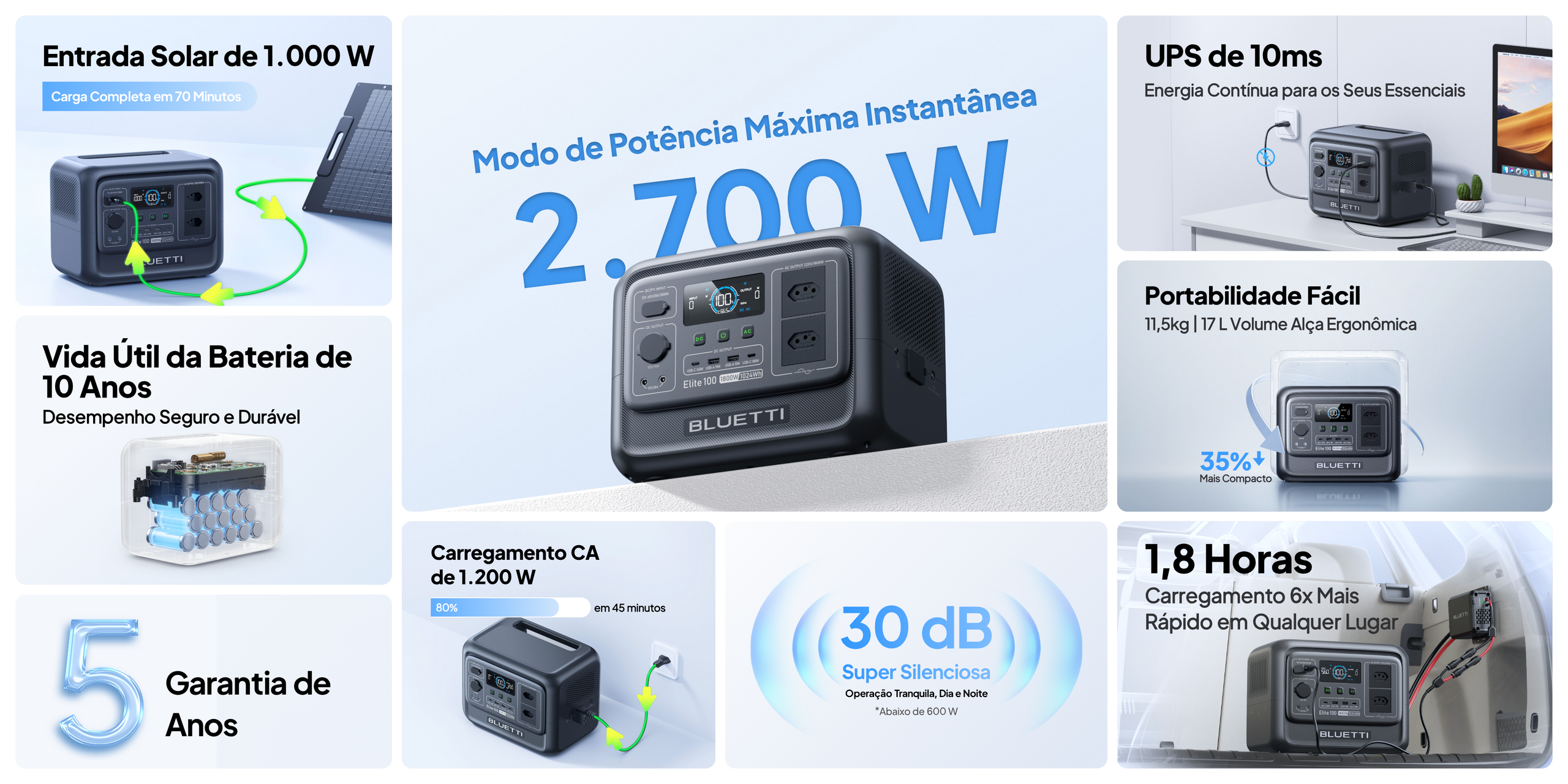 Sim. Com tempo de comutação de 10ms, o Elite 100 V2 entra em ação instantaneamente durante quedas de energia — mantendo geladeira, computador ou equipamentos médicos funcionando sem interrupção.