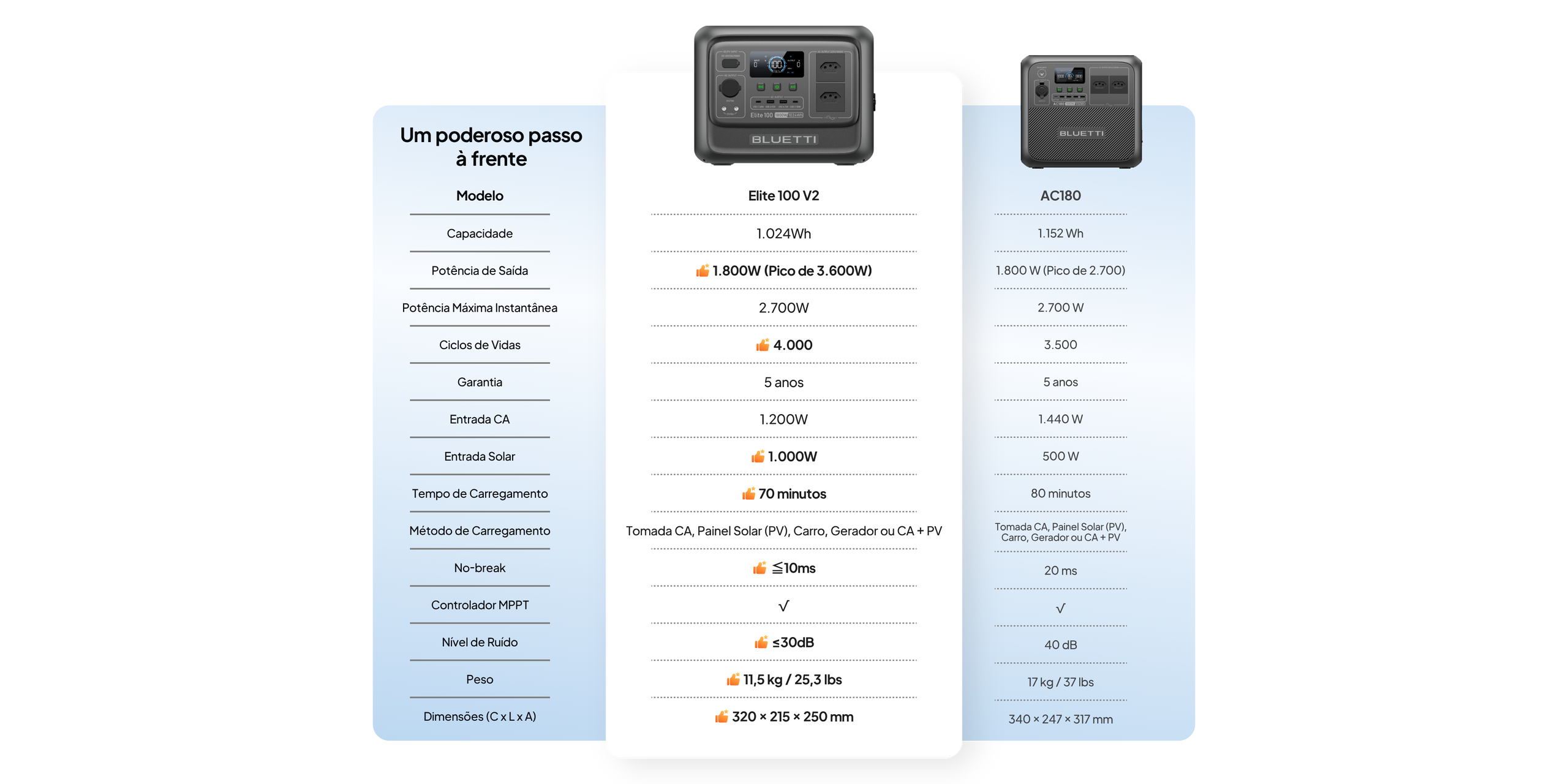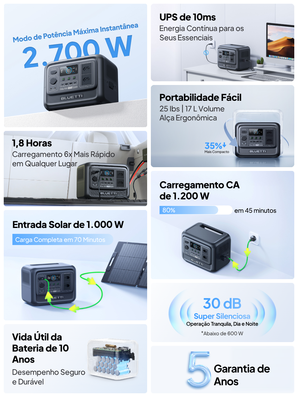 Modo de Memória de Energia – Uma vez ativado, o Elite 100 V2 retoma automaticamente a alimentação dos dispositivos assim que a energia da rede volta — sem reinicialização manual.