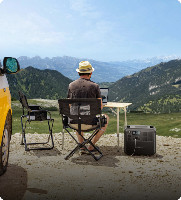 Pegue a estrada e leve sua casa com você. As estações de energia ecológicas e o gerador solar para RV da BLUETTI mantêm seus dispositivos carregados, a geladeira funcionando e as noites brilhantes. Seja trabalhando na natureza ou observando as estrelas, aproveite o conforto de casa em cada aventura de vanlife.