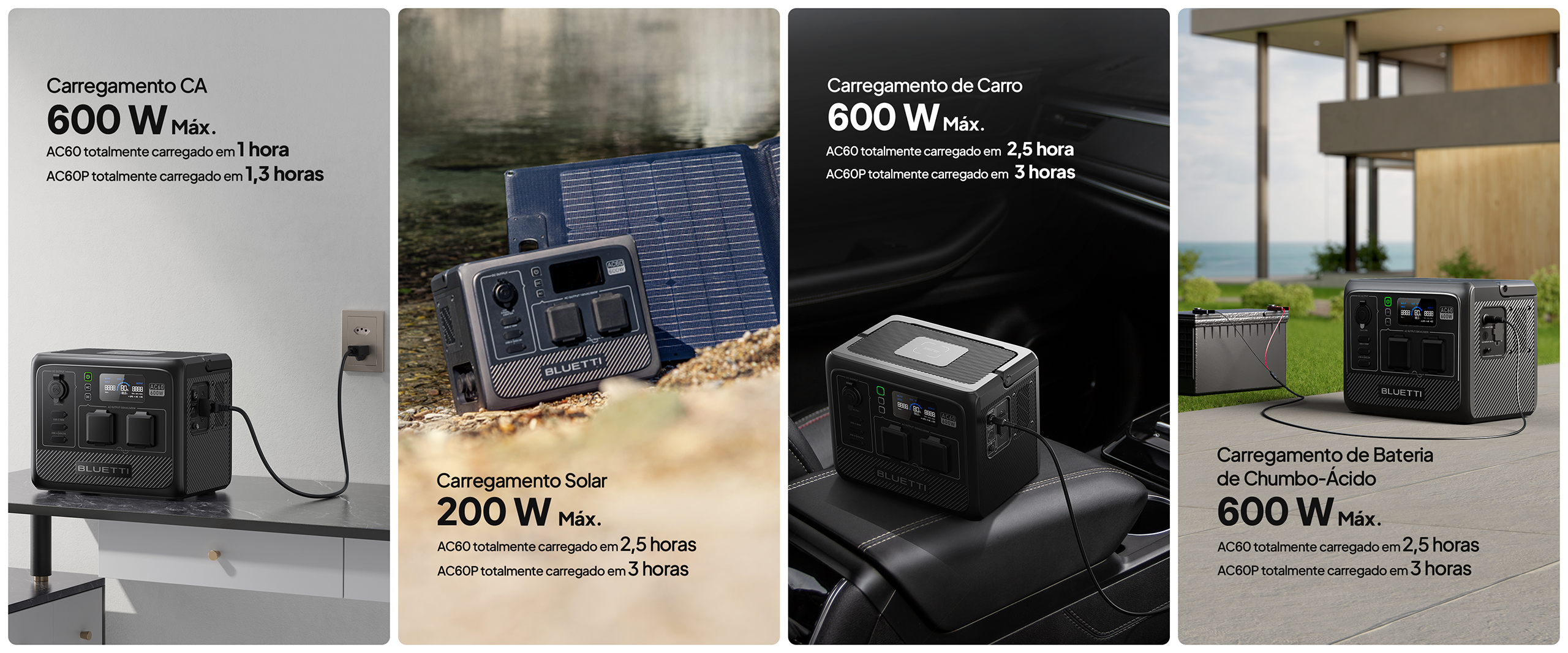 • 4 Formas de Recarregar (AC/Solar/Carro/Bateria de chumbo-ácido)