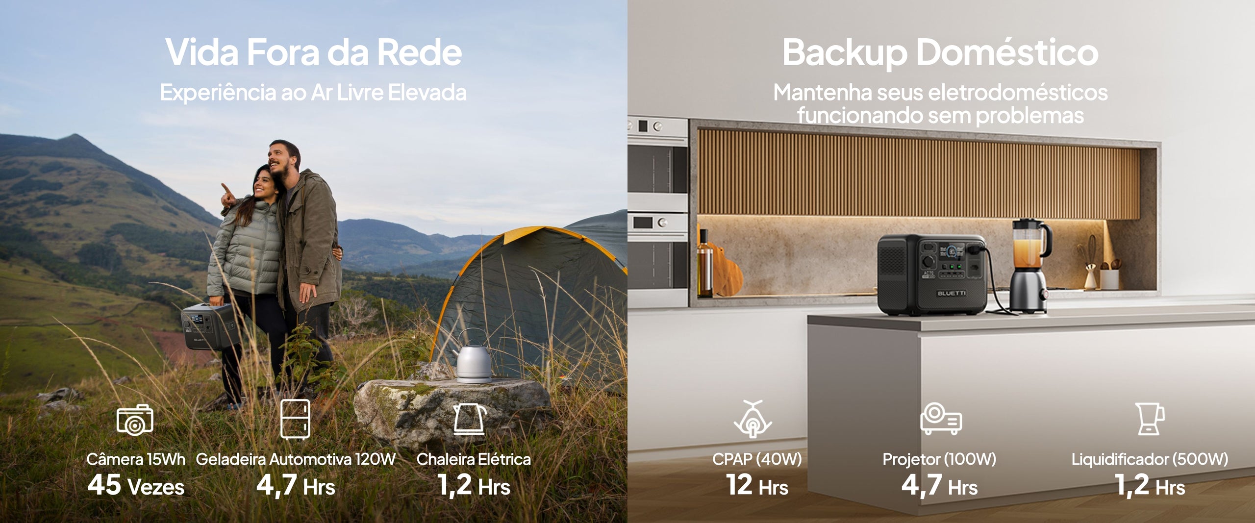 O BLUETTI AC70 possui 1.000 W de potência contínua e múltiplas tomadas para conectar vários aparelhos simultaneamente. Ative o Modo de Power Lifting* no aplicativo BLUETTI para alimentar seus aparelhos que consomem muita energia com facilidade, como secadores de cabelo, chaleiras elétricas, cobertores elétricos, aquecedores, etc. * O Modo de Power Lifting permite que o AC70 suporte cargas resistivas de alta potência de até 2.000 W.