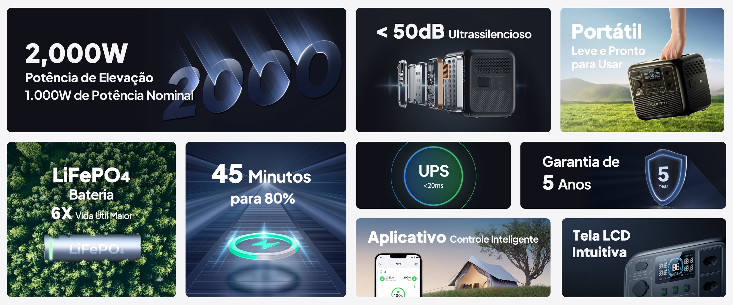 Bem integrado com o LiFePO₄ mais seguro, o AC70 consegue manter 80% da capacidade mesmo após mais de 3.000 ciclos de carga. Ele também conta com um BMS (Sistema de Gerenciamento de Bateria) inteligente para evitar possíveis danos e uma garantia de 5 anos para ajudar você a usar a bateria com tranquilidade.