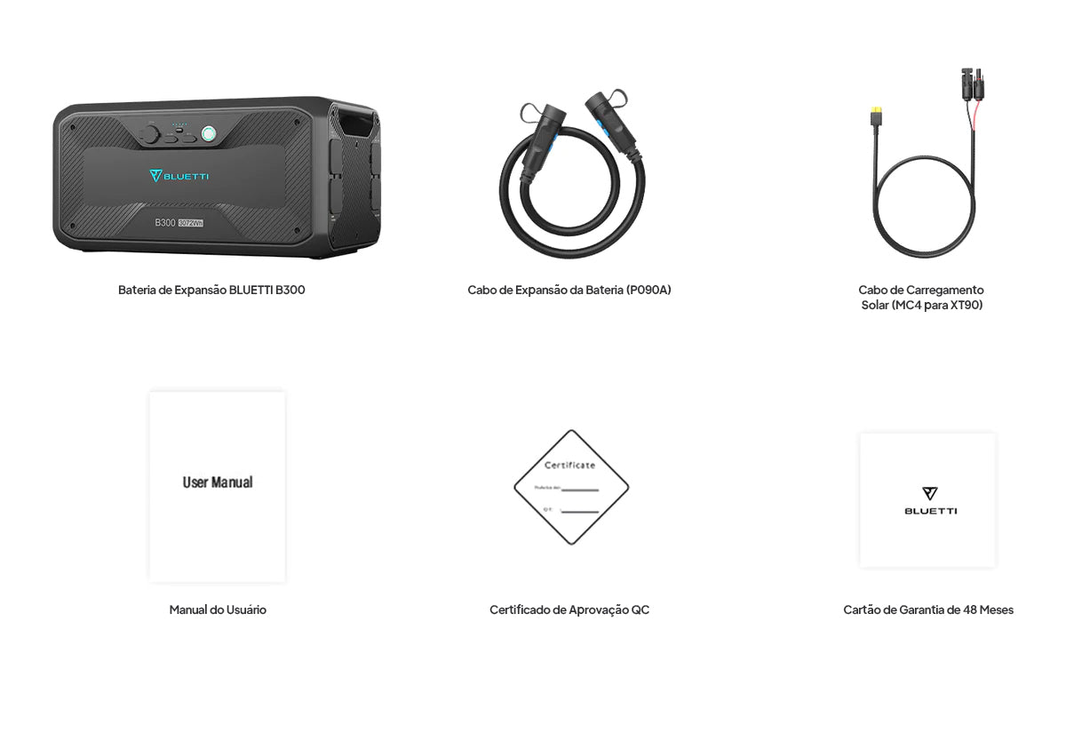 P1: Quais estações de energia BLUETTI podem funcionar com a B300?R:AC300/AC200/AC200P/AC200MAX/EB150/EB240/EP500Pro. Com exceção da AC300, é necessário um acessório adicional para cada estação.