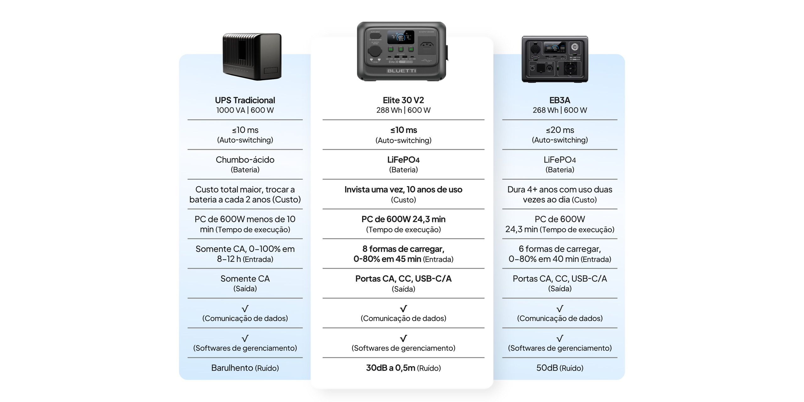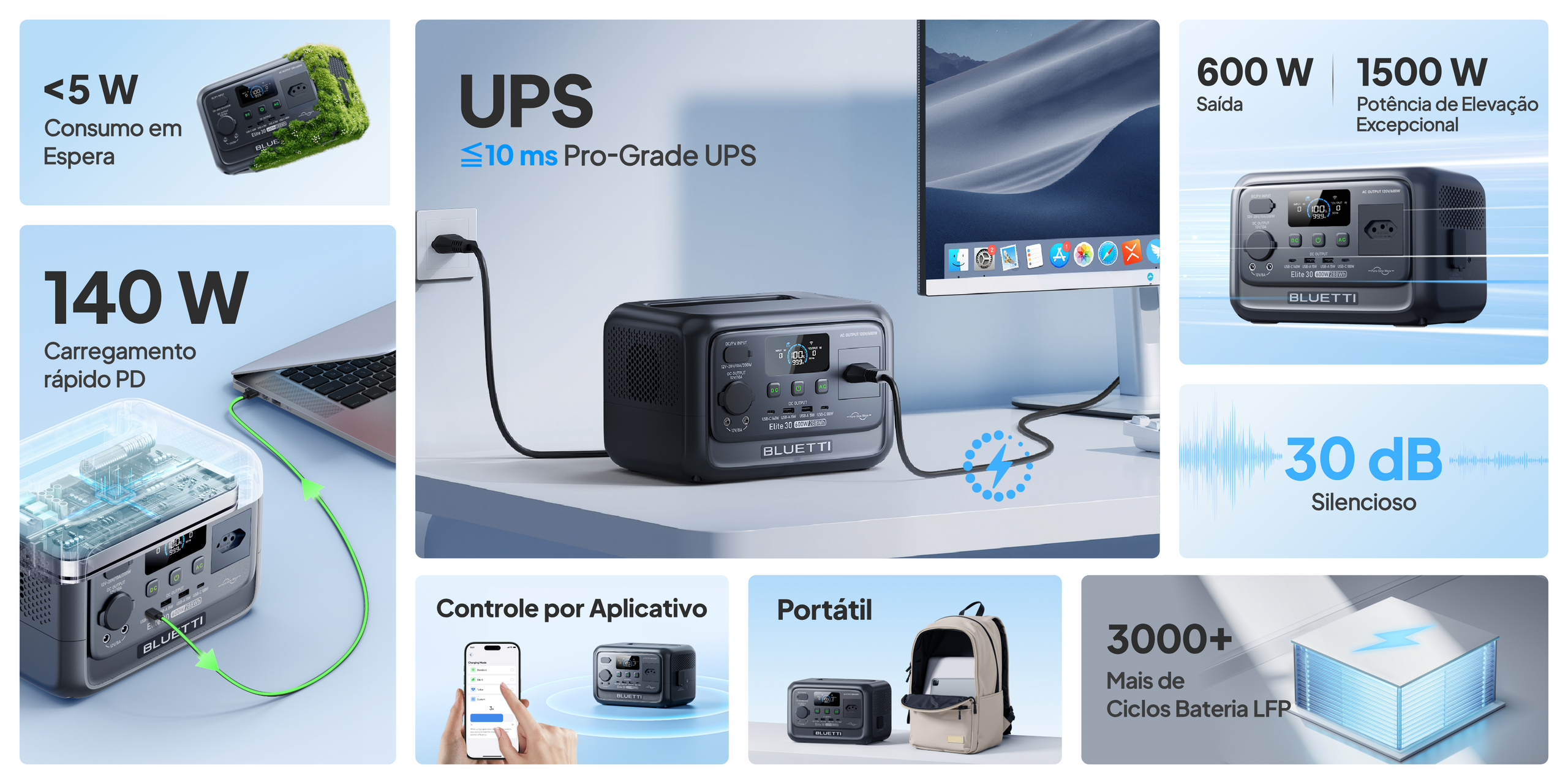 R:Quando ativado, o Modo de Memória reinicia automaticamente o Elite 30 V2 após uma queda de energia e retoma a alimentação dos dispositivos conectados. Você não precisará ligá-lo manualmente — ideal para uso ininterrupto.