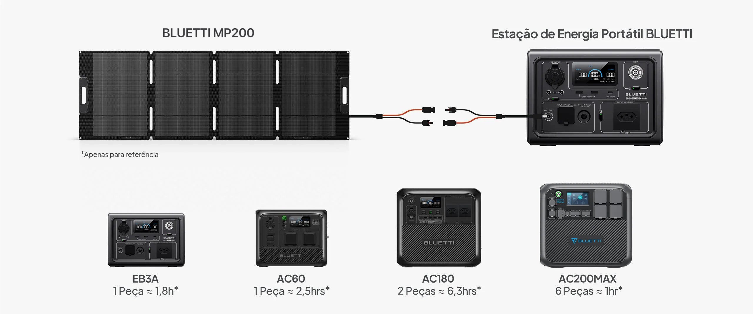 R:Não. Em geral, não é incentivada a mistura de diferentes painéis solares. Para obter o sistema de painel solar mais eficiente, recomendamos o uso de painéis solares do mesmo tipo e do mesmo fabricante. Por exemplo, dois MP200 carregando o BLUETTI AC200P é aceitável, enquanto um PV200+ um MP200 não é sugerido.